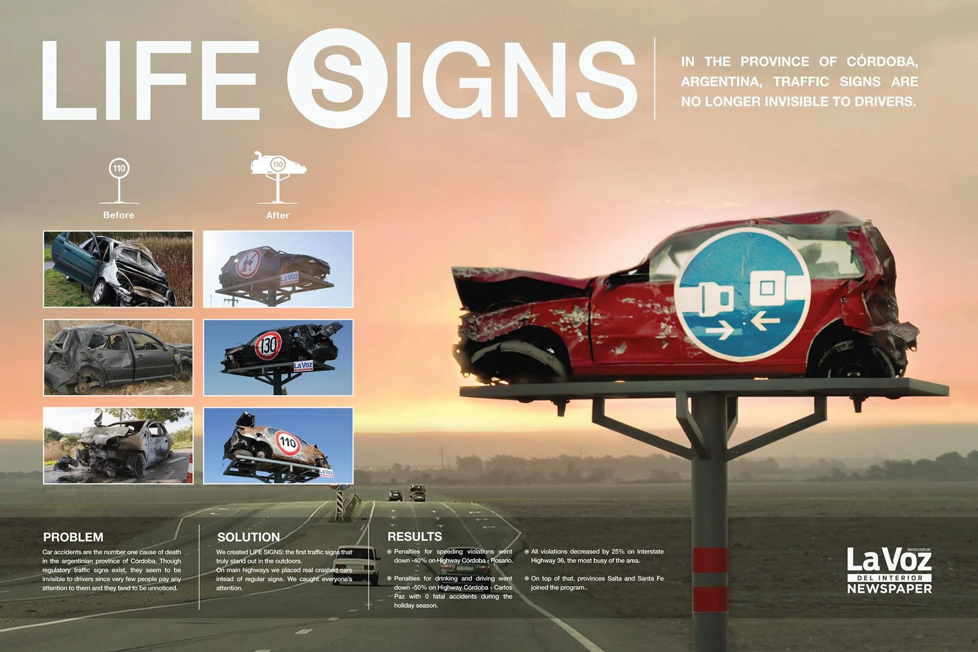 Car accidents are the number 1 cause of death in the province of Cordoba, Argentina. Traffic signs are there, but people don’t seem to notice them. So in partnership with ‘La Voz Del Interior’ (Cordoba’s most popular newspaper) we created a simple and powerful solution: Traffic signs impossible to ignore.